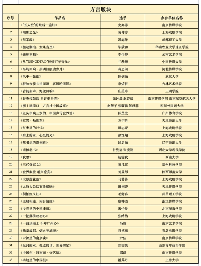 方言版块入围名单(按照作品首字母顺序排列):