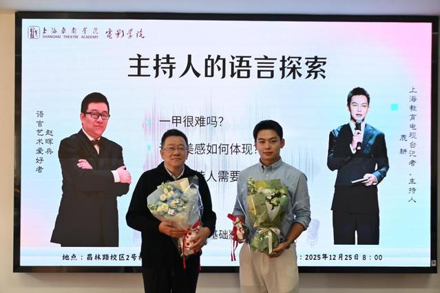 语言是传播的核心载体,语言能力是播音主持专业的立身之本。作为播音主持专业本科一年级的核心专业课,上海市重点课程《主持人语音基础》始终坚持以培养学生的语声创造能力与审美能力为核心,深度融合专业技能、媒介素养与思政教育,筑牢主持人的语言根基。12月25日上午,课程特邀资深语言艺术爱好者赵晖兵、上海教育电视台记者、主持人鹿耕走进课堂,以生动的实际个案赋能教学,为同学们带来了一场兼具专业深度与人文温度的课程分享。