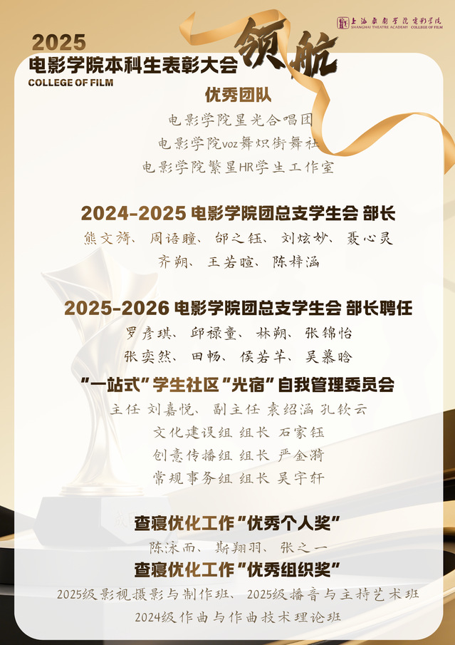 凝聚奋进力量,礼赞榜样光芒。2025年12月18日,上海戏剧学院电影学院“领航”2025本科生表彰大会在昌林校区顺利举行。大会以光影为媒,通过“初心如磐·榜样领航”、“艺海扬帆·奋楫笃行”、“薪火相传·筑梦未来”三大篇章,在岁末之际,将过去一学年的耕耘与收获剪辑成册,也为崭新的征程吹响了嘹亮的号角。