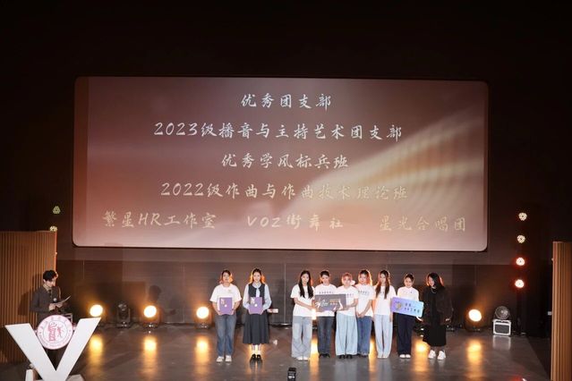大会表彰了在学风建设、团支部工作及文体活动中表现卓越的集体。2022级作曲与作曲技术理论班(优秀学风标兵班)、2023级播音与主持艺术团支部(优秀团支部),繁星HR工作室(学生)、VOZ街舞社、星光合唱团获“优秀团队”。百花齐放,各擅胜场,这些集体是学院活力与创造力的最佳证明。