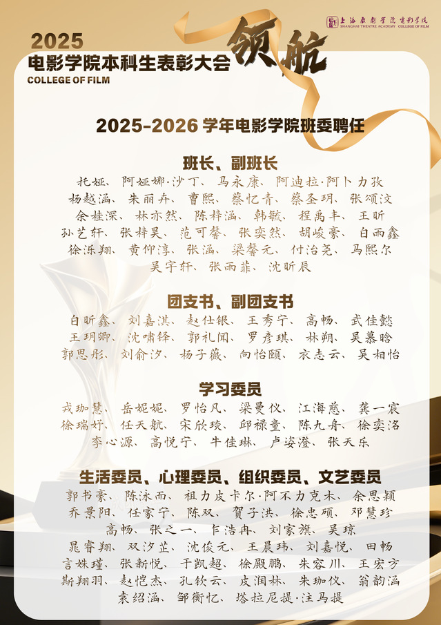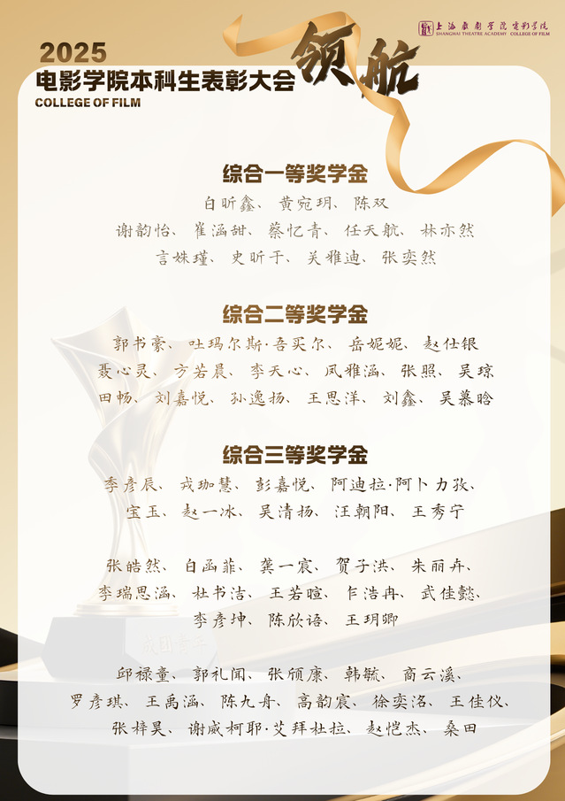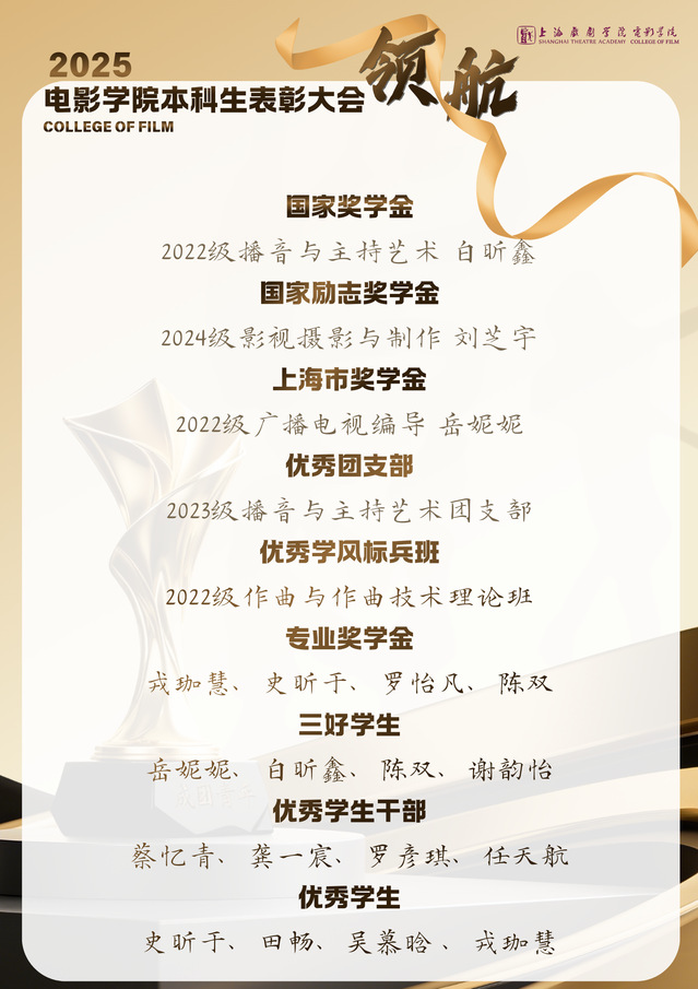 凝聚奋进力量,礼赞榜样光芒。2025年12月18日,上海戏剧学院电影学院“领航”2025本科生表彰大会在昌林校区顺利举行。大会以光影为媒,通过“初心如磐·榜样领航”、“艺海扬帆·奋楫笃行”、“薪火相传·筑梦未来”三大篇章,在岁末之际,将过去一学年的耕耘与收获剪辑成册,也为崭新的征程吹响了嘹亮的号角。