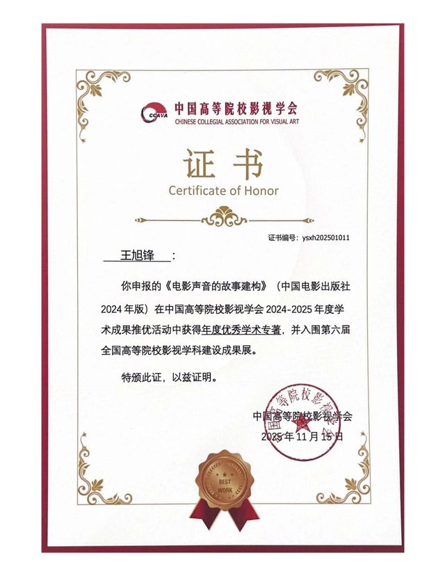 在年会学术成果推优环节,王旭锋教授的《电影声音的故事建构》获“年度优秀学术专著”。