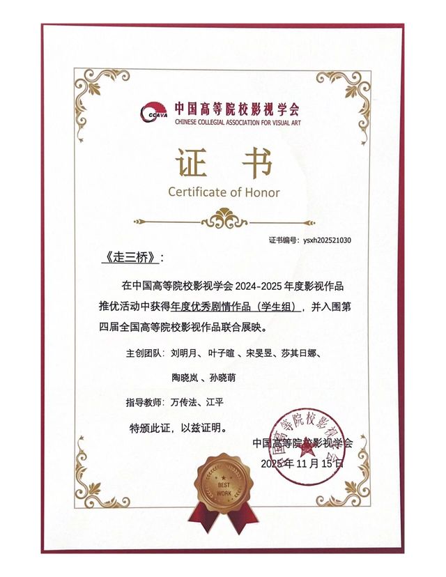在本届中国高校影视学会的各项推优中我院师生作品再获佳绩。年会作品推优环节,由上海戏剧学院电影学院联合摄制的《黑瓦白虹》荣获“年度优秀剧情片作品(教师组)”和“年度优秀声音作品(教师组)”。我院学生作品《执马者》《走三桥》《母亲的葬礼》分别获得“年度优秀剧情片作品(学生组)”,LINE获得“年度优秀短视频作品(学生组)”。