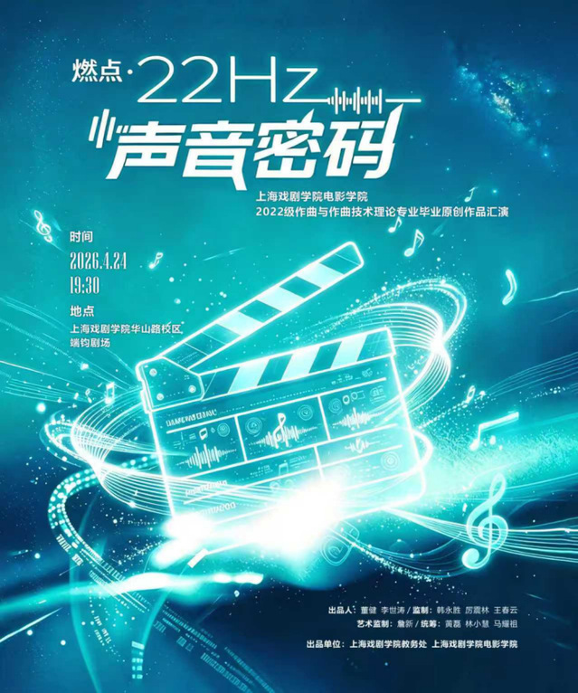 春华秋实,积厚成势,四年的学习时光转瞬即逝,过往积累沉淀于此刻。上海戏剧学院电影学院2022级作曲与作曲技术理论专业毕业原创作品汇演「燃点·22Hz 声音密码」将于2026年4月24日19:30在华山路校区端钧剧场举行。