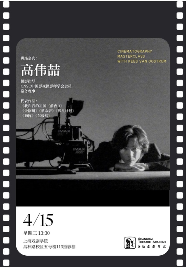 近日,电影摄影指导高伟喆应邀来到上海戏剧学院电影学院开展专题讲座分享课。上海戏剧学院电影学院院长董健和Kees Van Oostrum教授热情接待。活动现场座无虚席,师生反响热烈。
